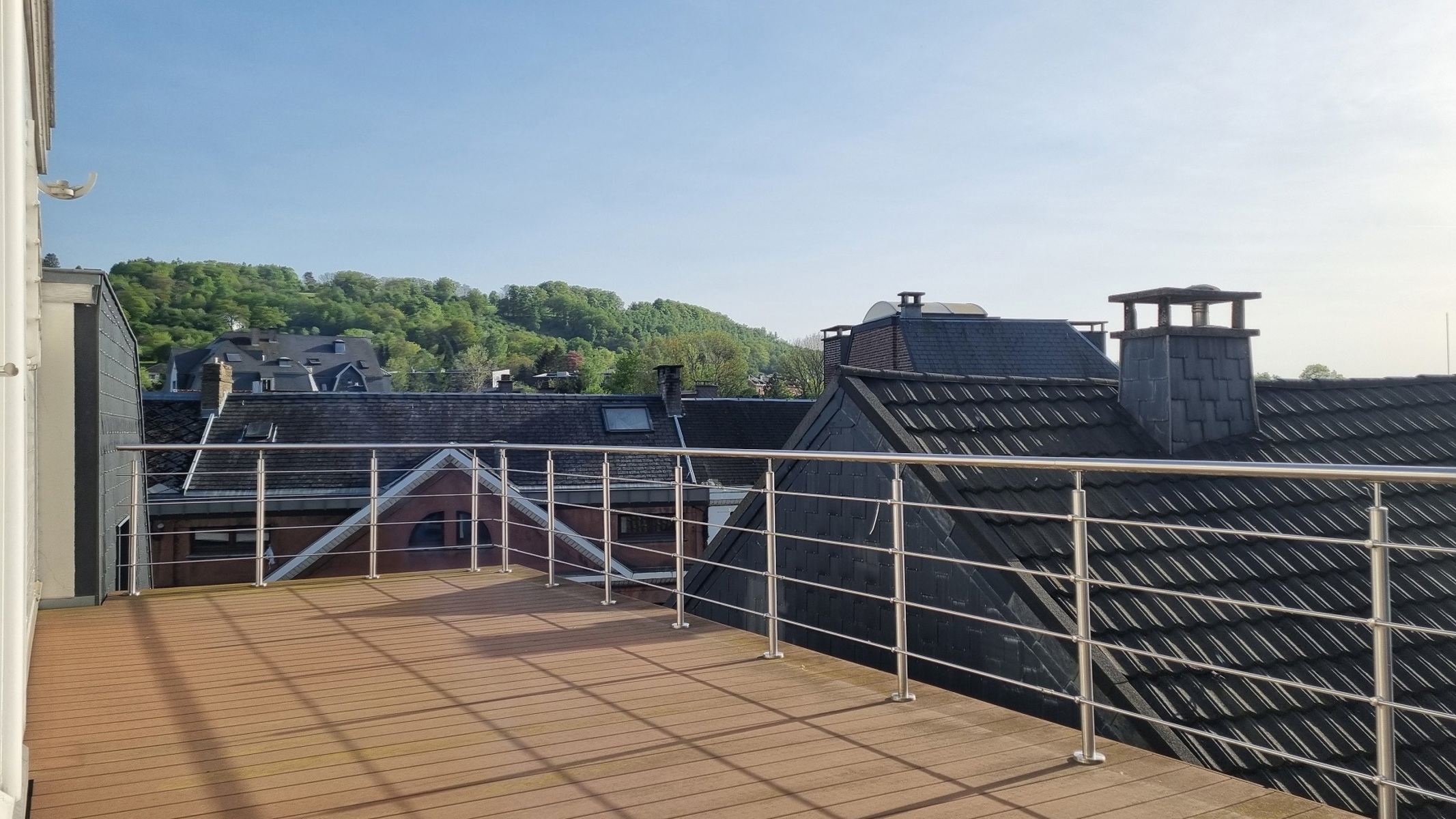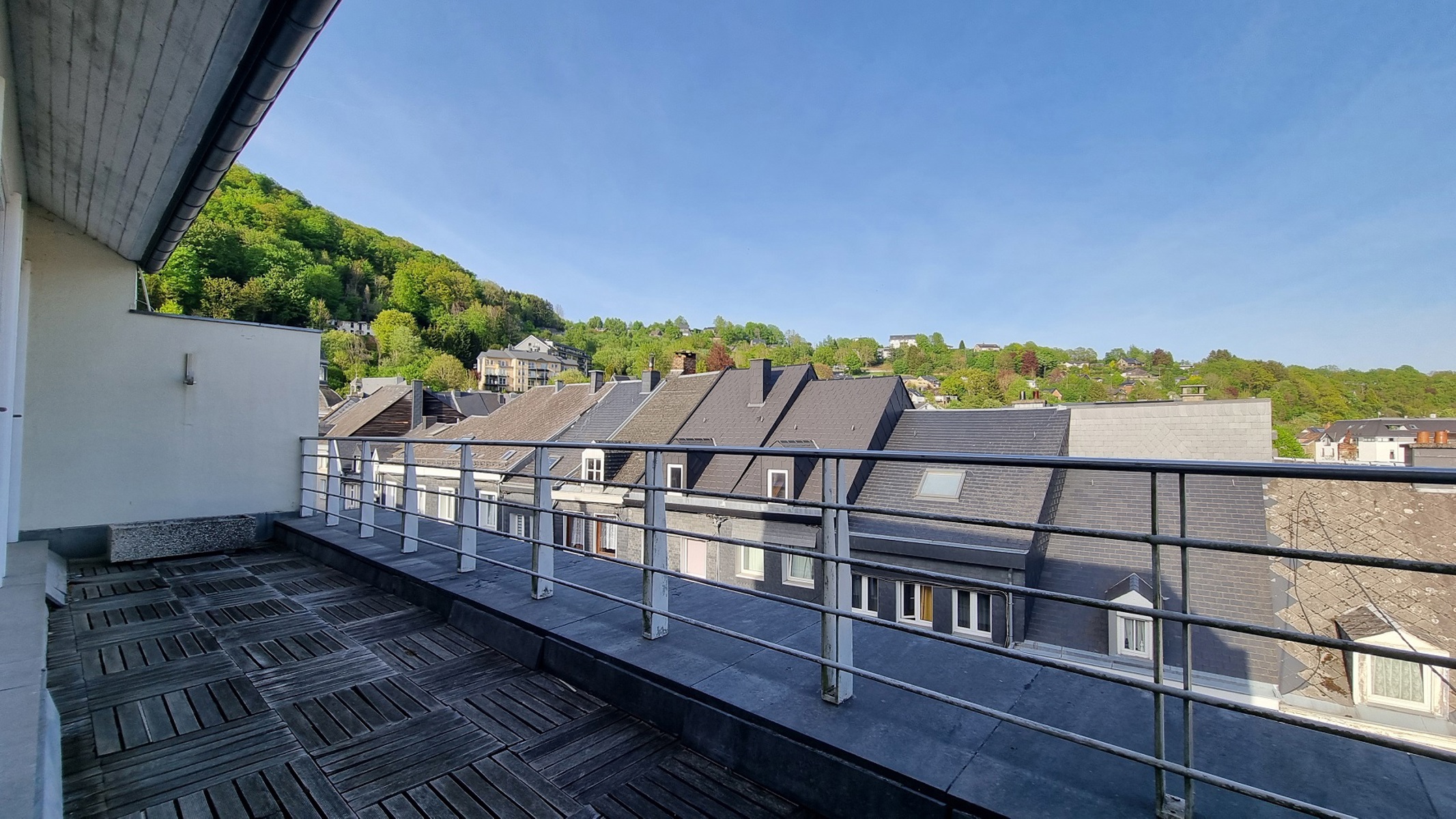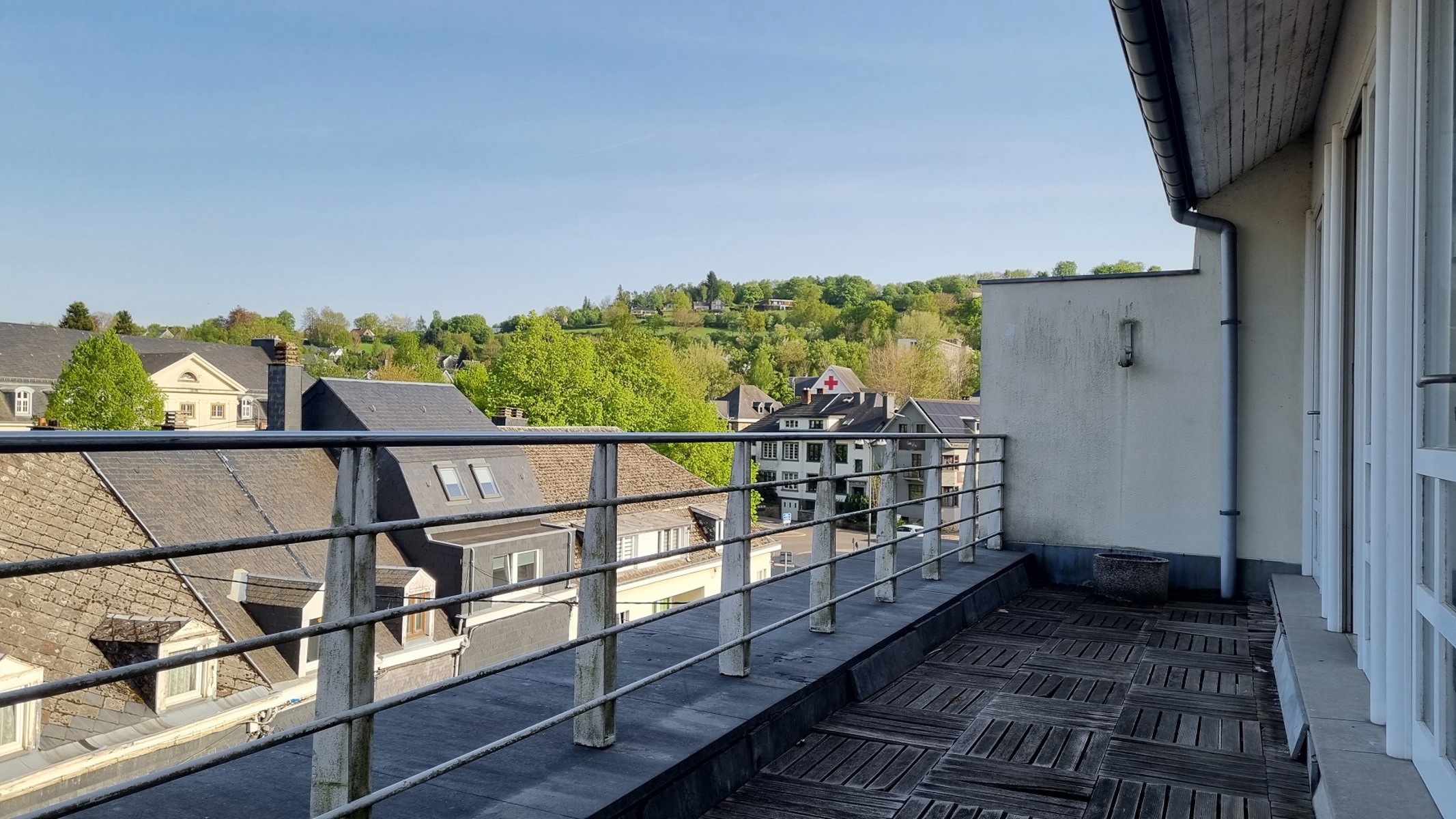 3ème étage : hall d’entrée, WC séparé, buanderie, coin vestiaire, énorme séjour avec terrasse de 19m² profitant d’une très belle vue sur les hauteurs de Malmedy, cuisine équipée (sauf frigo), salle à manger avec accès à la 2ème superbe terrasse de 31m² profitant également d’une très belle vue.