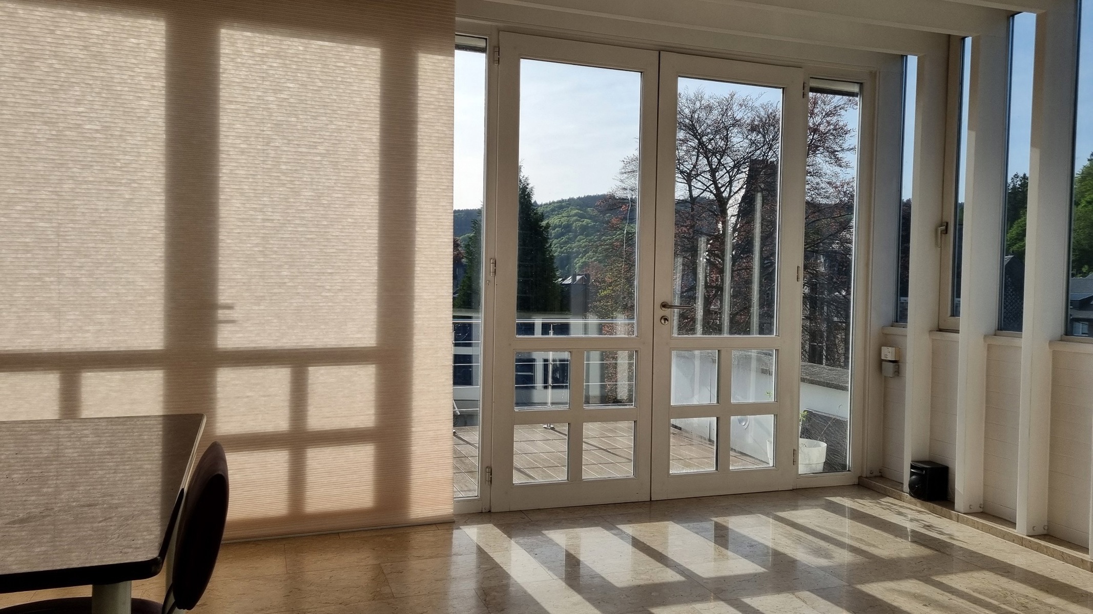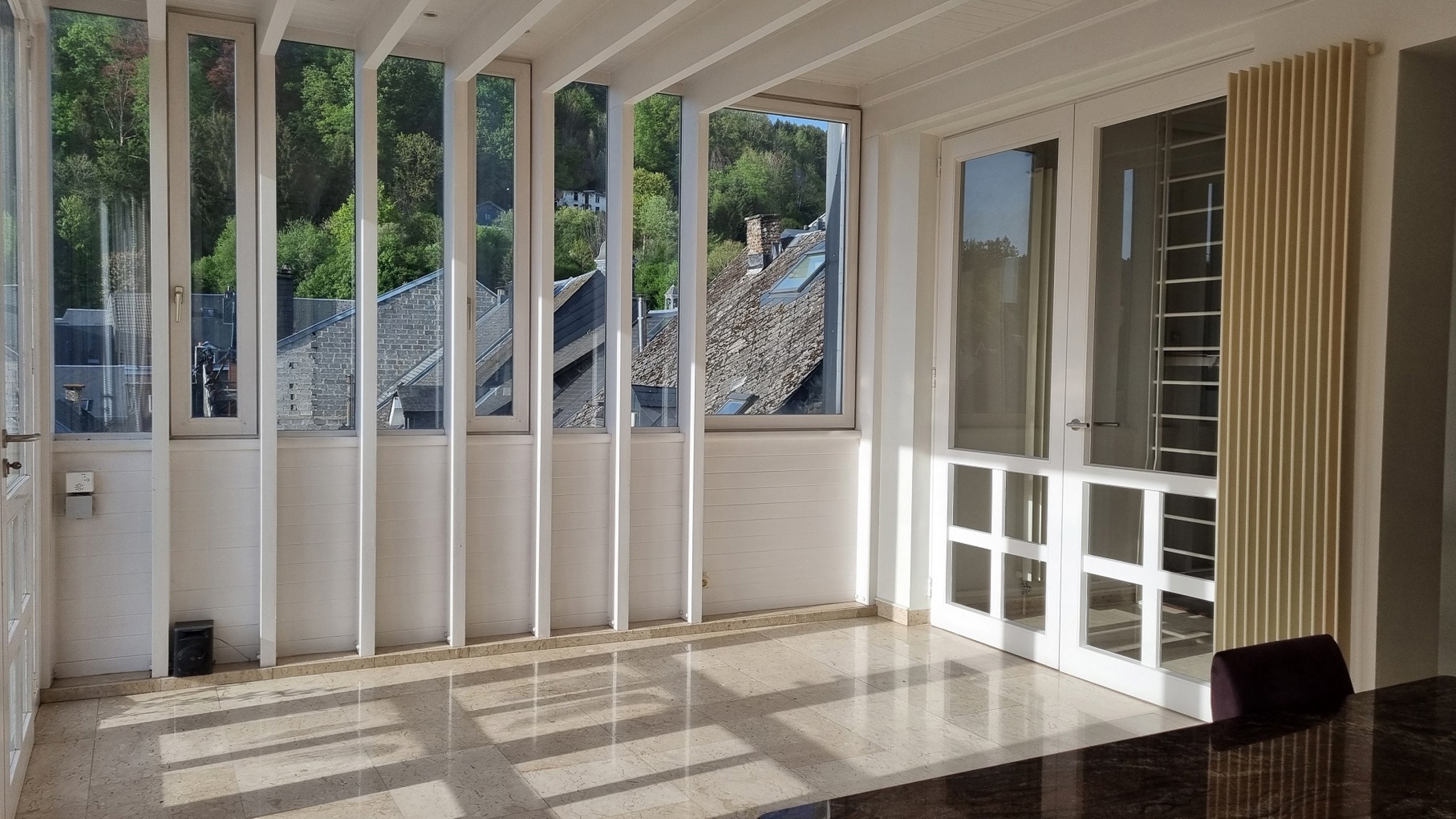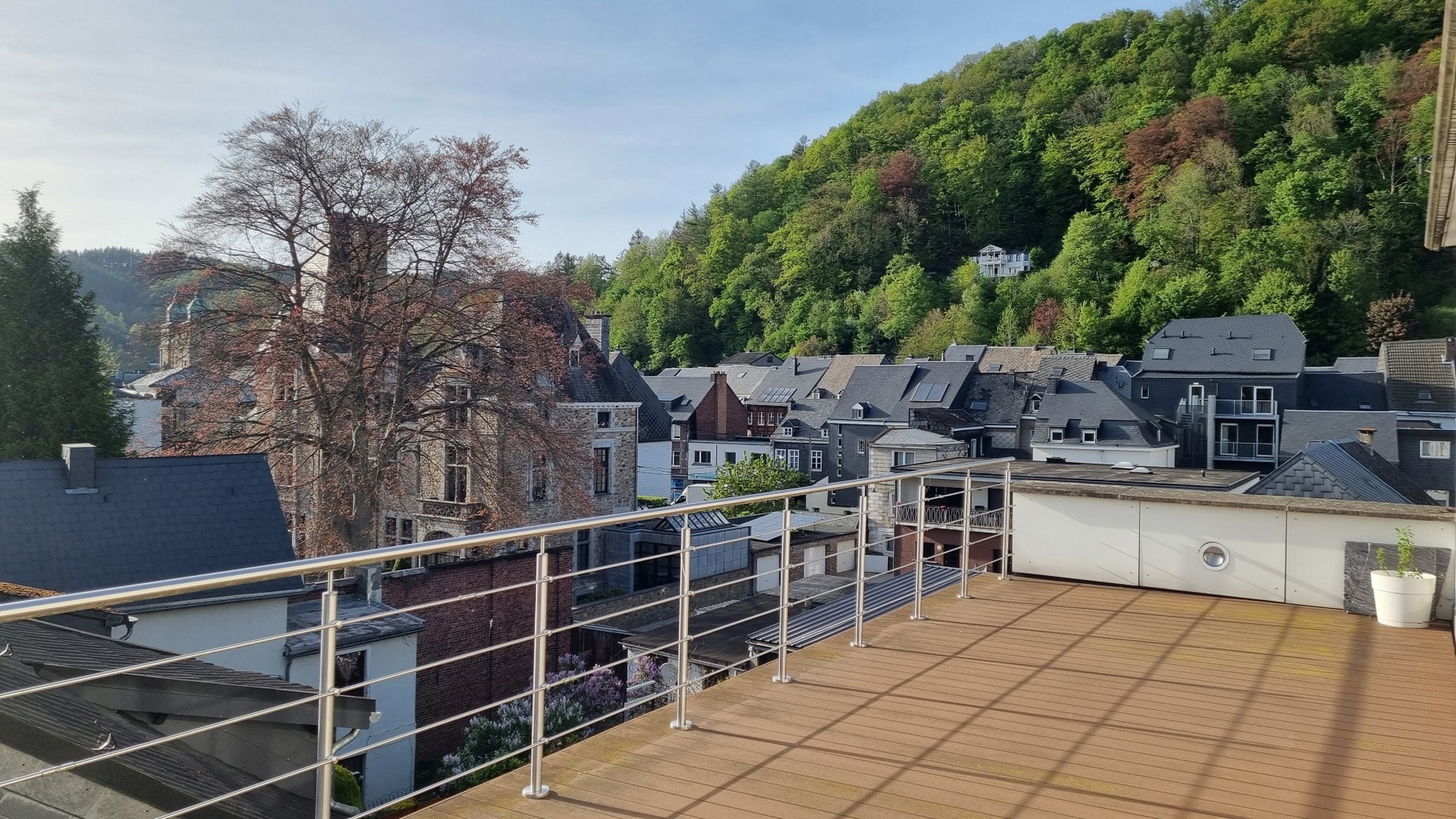 3ème étage : hall d’entrée, WC séparé, buanderie, coin vestiaire, énorme séjour avec terrasse de 19m² profitant d’une très belle vue sur les hauteurs de Malmedy, cuisine équipée (sauf frigo), salle à manger avec accès à la 2ème superbe terrasse de 31m² profitant également d’une très belle vue.