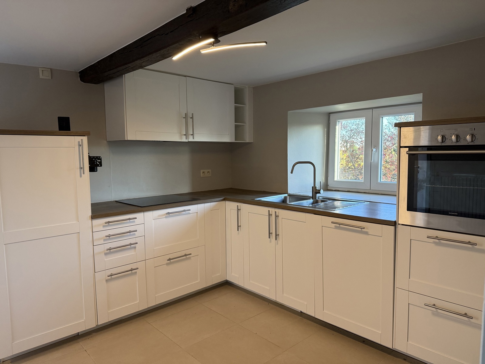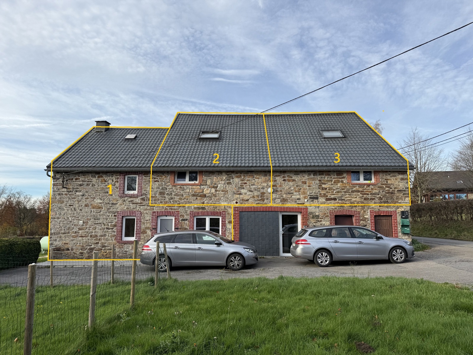 Numéro 1 : Hall d’entrée, cuisine, séjour, buanderie, WC séparé, salle de bain (lavabo & douche) – 1er étage: 2 chambres et un bureau (ou 3e chambre) – cave et garage