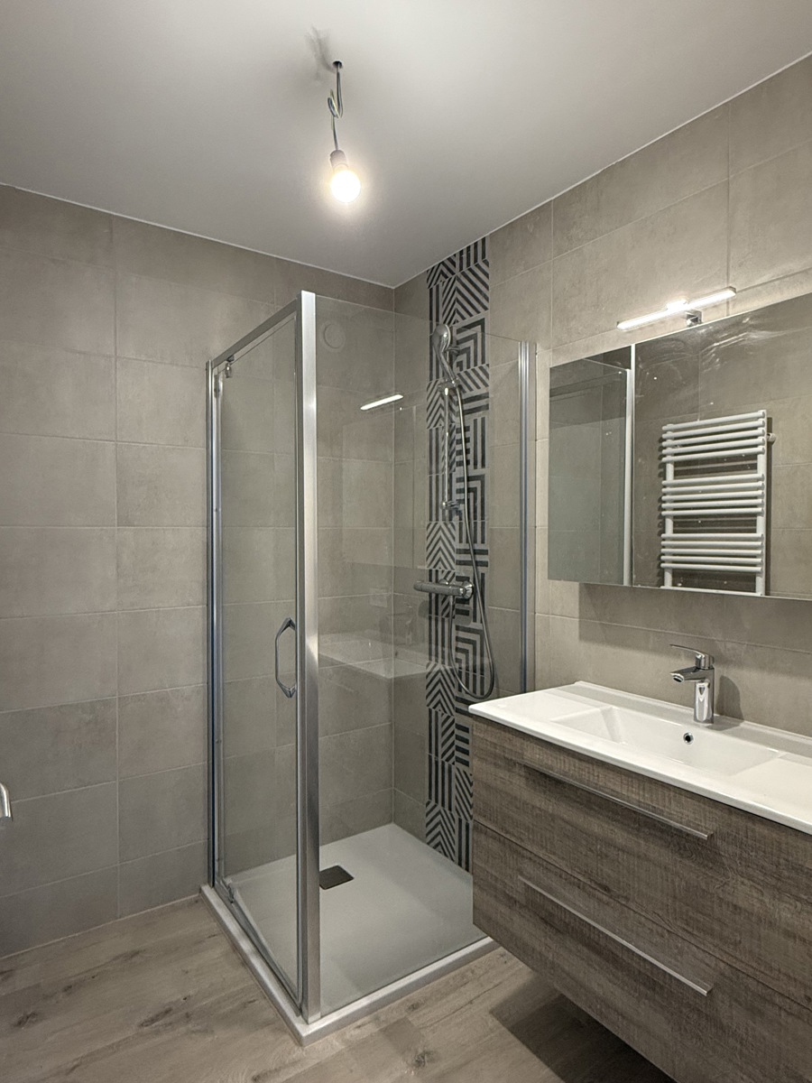 Composition : sas d’entrée, buanderie, WC séparé, cuisine équipée (four, frigo, lave-vaisselle, taque, hotte, évier) ouverte sur le séjour, terrasse, salle de douche (douche, lavabo et sèche serviettes), 2 chambre à coucher.
