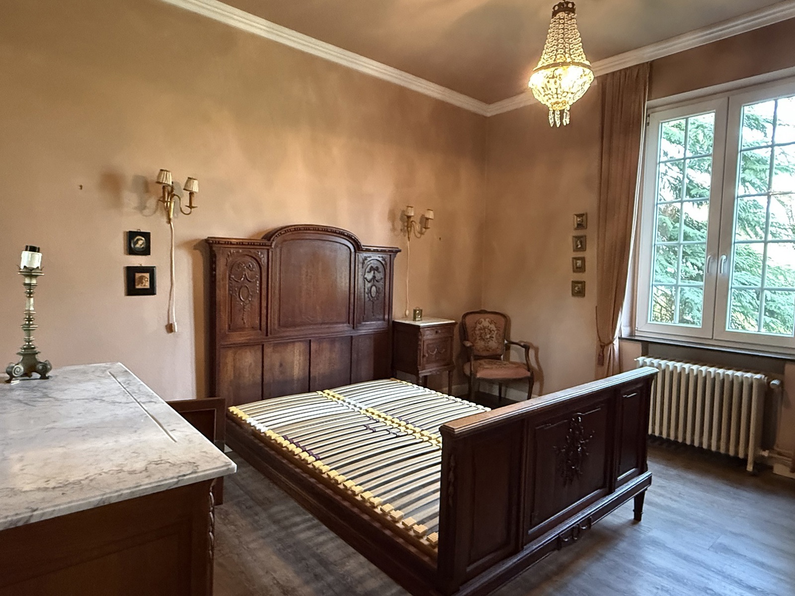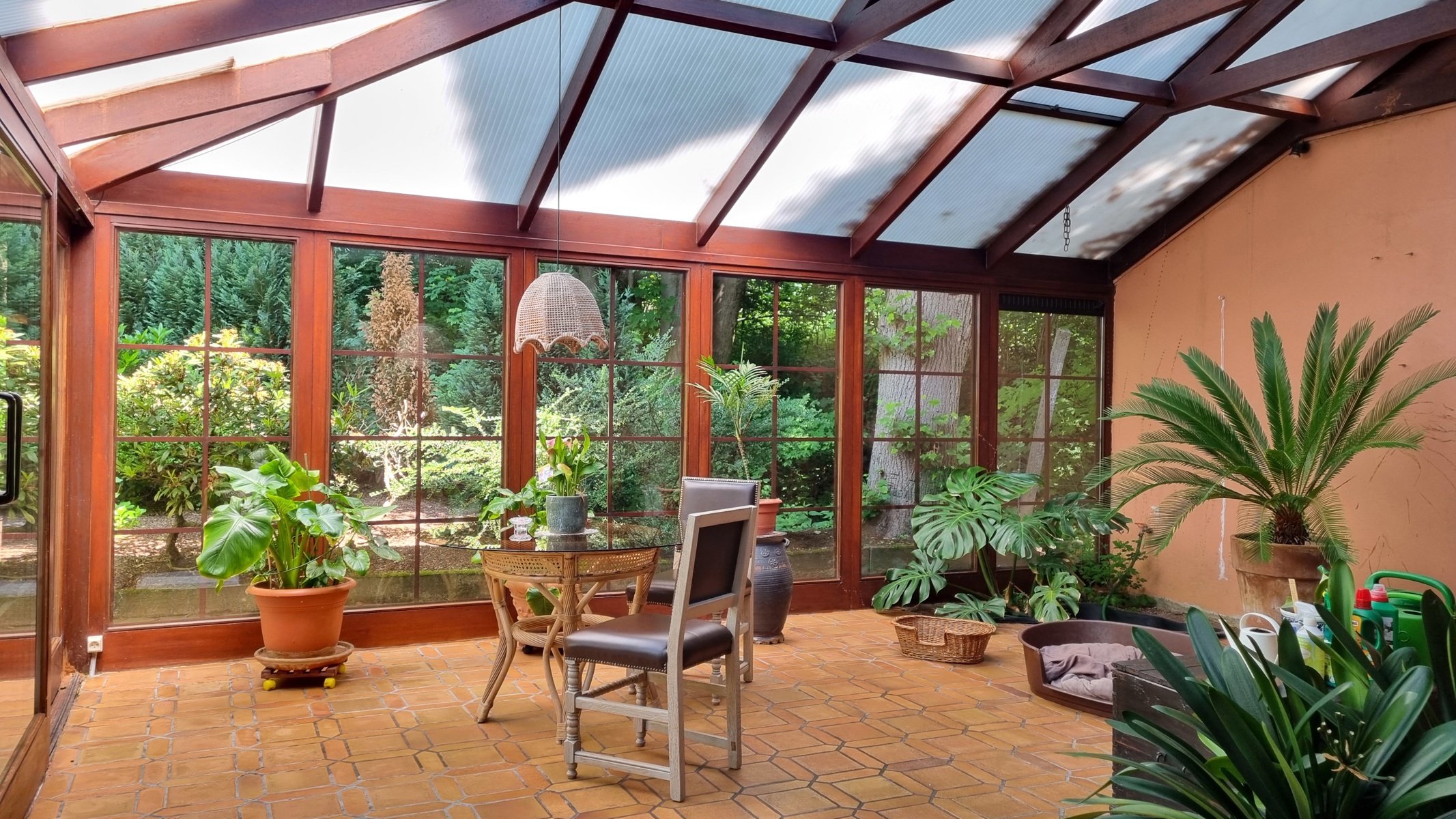 Au rez-de-chaussée : hall d’entrée, grande cuisine, salon ouvert sur la salle à manger, véranda donnant sur un jardin arboré et un WC séparé.